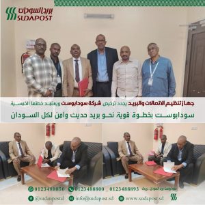 The agreement was signed at the Authority’s headquarters in Omdurman. Mr. Abubakr Mohammed Abdullah represented Sudapost, while Mr. Abubakr Essam represented the National Telecommunications and Postal Regulatory Authority.